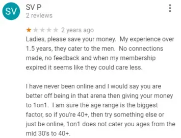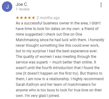 Google reviews for One on One Matchmaking are mostly positive, resulting in a 4.6-star rating. Both of these clients met someone through the service: