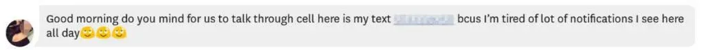 - The first message you receive contains a phone number, link, or other contact information that will move the conversation off the app. For instance, a bot may point you toward a cam girl site, or to a malicious website for “verification.”