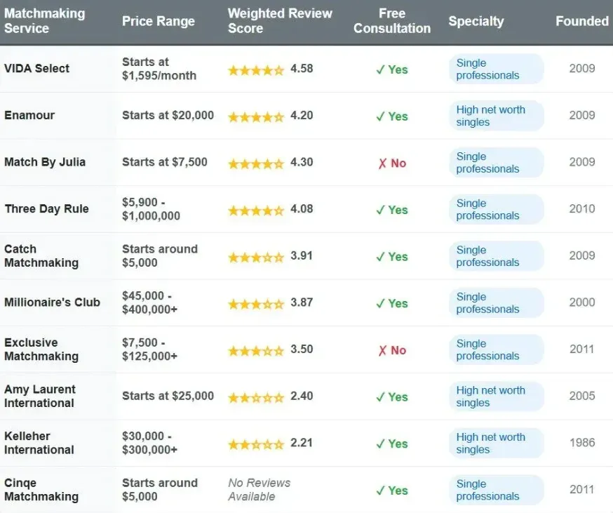Matchmaking ServicePrice RangeTotal ReviewsWeighted Review ScoreFree ConsultationSpecialtyFounded