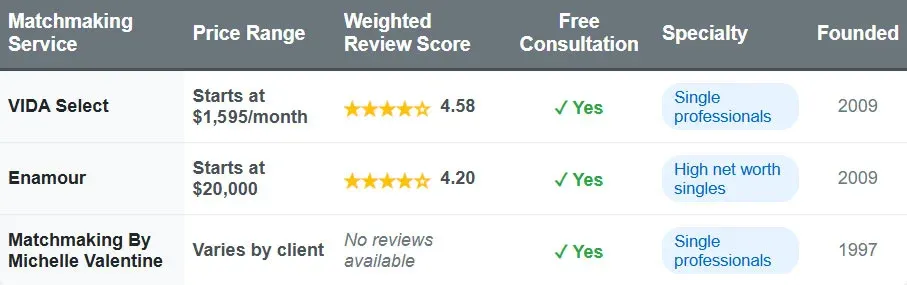 Matchmaking ServicePrice RangeTotal ReviewsWeighted Review ScoreFree ConsultationSpecialtyFounded