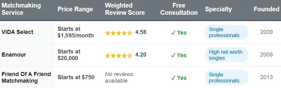 Matchmaking ServicePrice RangeTotal ReviewsWeighted Review ScoreFree ConsultationSpecialtyFounded
