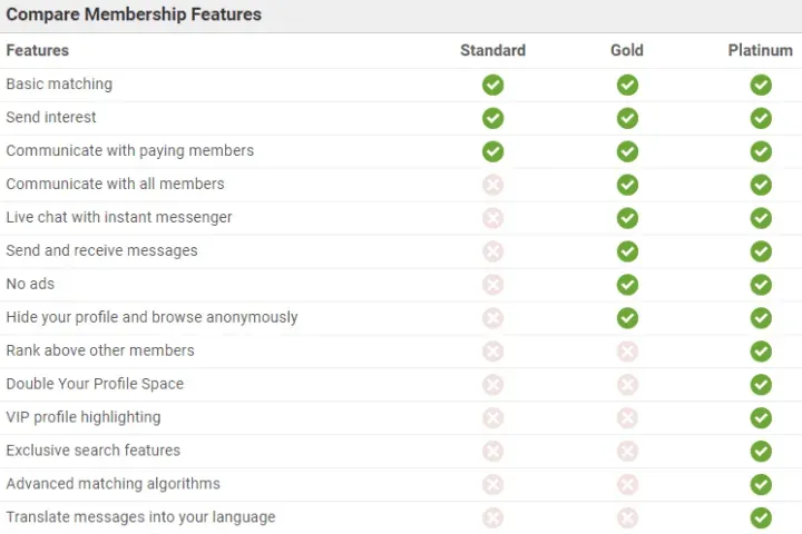 Filipino Cupid offers two paid subscriptions: a Gold membership that starts at $34.99 a month, and a Platinum membership starting at $39.99 a month. Committing to a 3- or 6-month membership will bring the monthly price of both levels down.
