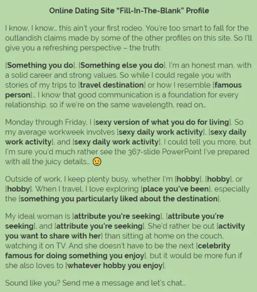 Check out these examples of POF profiles that work. And if you’re really struggling for inspiration, this fill-in-the-blank POF profile template should cure even the worst case of “About Me” writer’s block:
