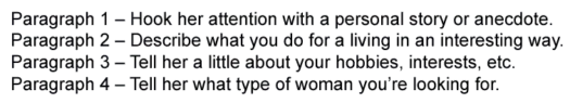 Research has found that spending 70% of your profile describing yourself and 30% of it describing what you’re looking for is the most attractive ratio to women. Think about what your ideal partner is like, and write a paragraph describing her, like this example: