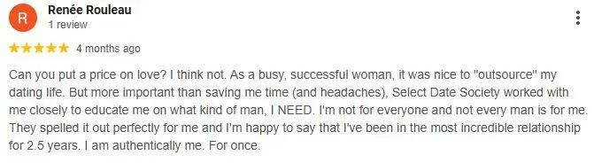 With 4.7 stars on their Google profile and 4.4 stars on Yelp, Select Date Society reviews are generally quite positive. Clients mentioned being happy with the quality of their matches, and also gaining insight into their own approach to dating throughout the experience.