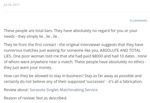 Common complaints being lack of matches, low quality matches, and promises made during the sales pitch that never came to fruition: