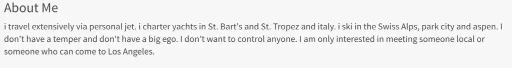 And overlooking grammatical mistakes, while claiming to be successful in business, is another red flag that can have her skipping over your profile:Â