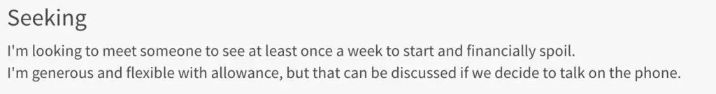 While this communicates something about yourself it doesnât really showcase what youâre offering her or show why she should choose you over all the other potential matches on Seeking.  Â