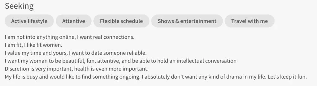 He could select a few more lifestyle badges, but this Seeking description does a good job of detailing his lifestyle and the type of woman/relationship he is interested in.Â