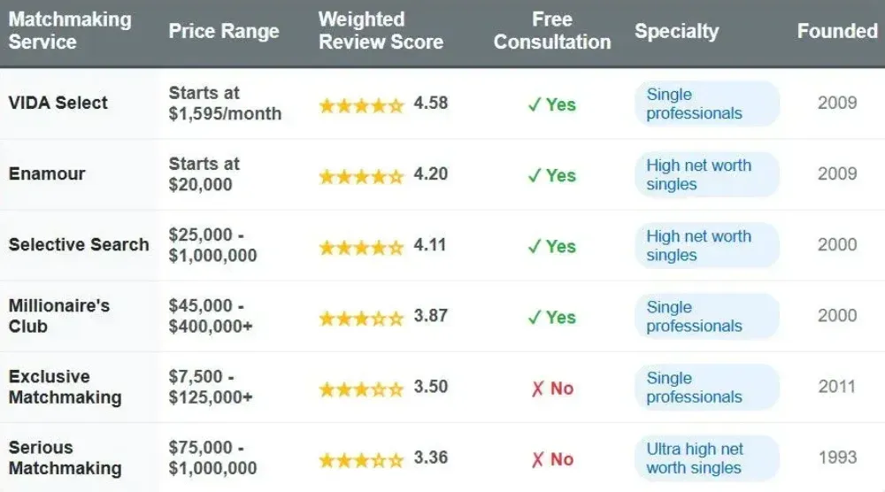 Matchmaking ServicePrice RangeTotal ReviewsWeighted Review ScoreFree ConsultationSpecialtyFounded