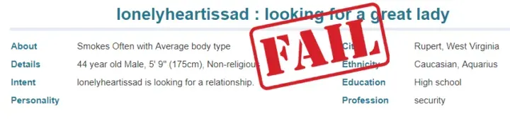 According to researchers, “likeability springs from subconscious initial impressions.” Your username is unmissable on POF, so it needs to make a good first impression. That’s why staying far, far away from words with negative connotations is crucial.