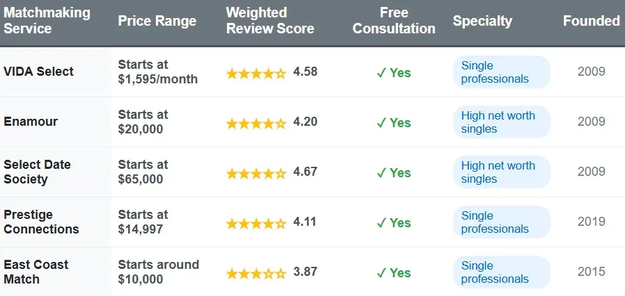 Matchmaking ServicePrice RangeTotal ReviewsWeighted Review ScoreFree ConsultationSpecialtyFounded