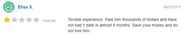 There aren’t many online reviews for this professional event planner/matchmaker. He's not rated by the BBB, nor are there any Social Club reviews or complaints listed there.
