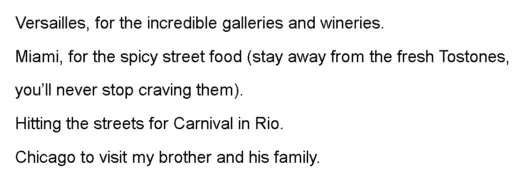 Including a few words about why each destination is a favorite gives her an enticing glimpse into your life. So that boring list of cities transforms into this: