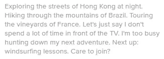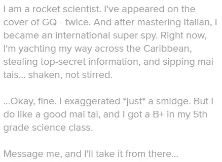 Profile Tip: Assuming your photos can back it up, this is the one style that potentially could work for any guy. Tales of adventure are universally appealing - what woman doesn’t get excited over a vividly described story packed with intrigue, travel, and a dash of danger?