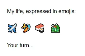 The words “I like to travel, surf, eat sushi, and go mountain biking” are less compelling than the same concept expressed in emoji form.