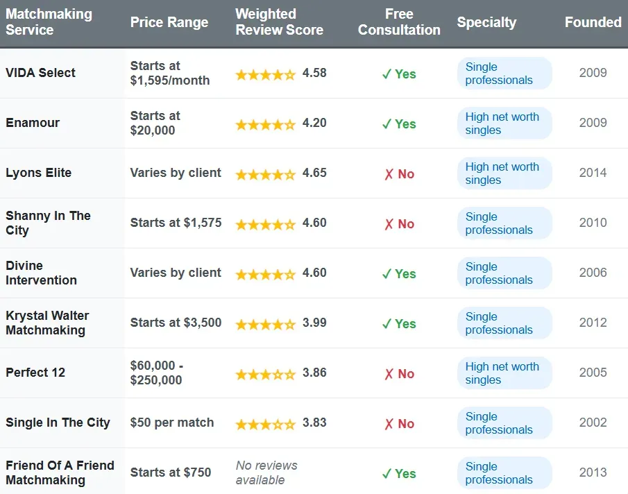 Matchmaking ServicePrice RangeTotal ReviewsWeighted Review ScoreFree ConsultationSpecialtyFounded